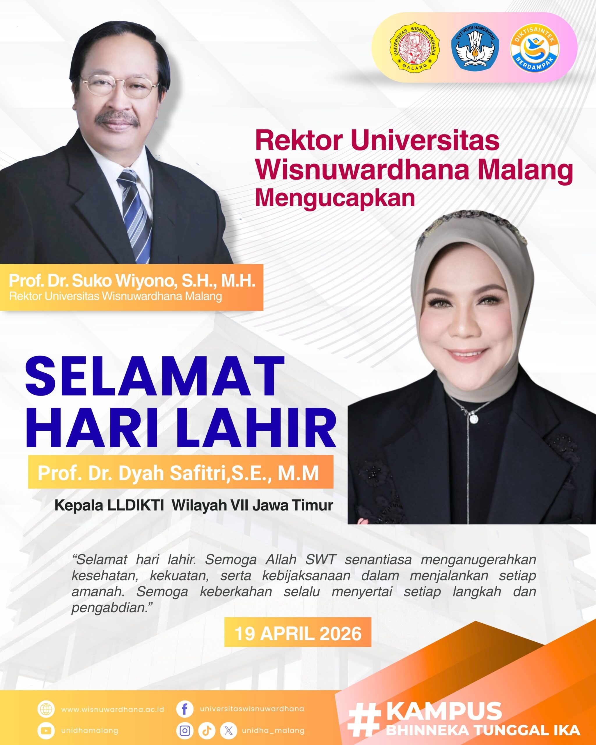 Unidha-Malang. Rektor Universitas Wisnuwardhana Malang, Prof. Dr. Suko Wiyono, S.H., M.H., menyampaikan ucapan selamat hari lahir kepada Prof. Dr. Dyah Safitri, S.E., M.M., selaku Kepala LLDIKTI Wilayah VII Jawa Timur, yang diperingati pada tanggal 19 April 2026.