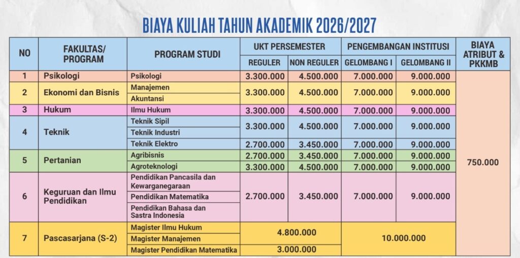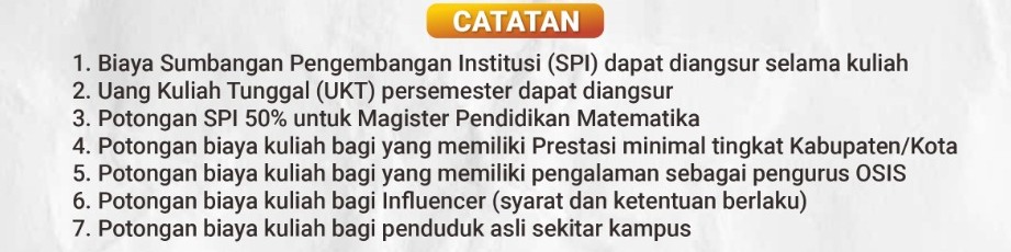 - Untuk dapat mengikuti kegiatan Perkuliahan, Mahasiswa harus menyelesaikan Biaya UKT dan Sumbangan Pengembangan Institusi (SPI) Minimum 50% + Biaya Atribut.